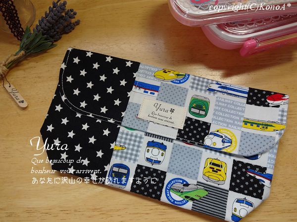 乗り物パッチワーク風ネイビー:封筒型弁当袋